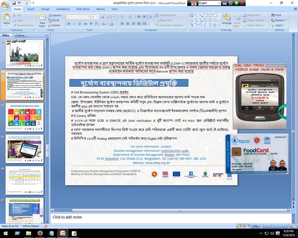 বিভিন্ন দুর্যোগের ক্ষয়ক্ষতি নিরূপণ - দেশে তথ্য ও যোগাযোগ প্রযুক্তি ব্যবহারে বিভিন্ন দুর্যোগের ক্ষয়-ক্ষতি নিরুপনের উদ্দেশে দুর্যোগ ব্যবস্থাপনা অধিদপ্তরে একটি ডিএনএ সেল (Damage and Need Assessment- DNA Cell) প্রতিষ্ঠা করা হয়েছে। ইতোমধ্যে ডিএনএ সেলে প্রয়োজনীয় যন্ত্রপাতি ও সফটওয়্যার স্থাপন ও সংযোজন করা হয়েছে। এই সেলের মাধ্যমে একটি Web-based Damage and Need Assessment Application তৈরির কাজ চলমান রয়েছে, যার মাধ্যমে অনলাইনে দ্রুততার সাথে মাঠ পর্যায় থেকে যেকোন দুর্যোগের ক্ষয়-ক্ষতির তথ্য সরাসরি দুর্যোগ ব্যবস্থাপনা অধিদপ্তরের সার্ভারে সংরক্ষণ ও সরবরাহ করা সম্ভব হবে।